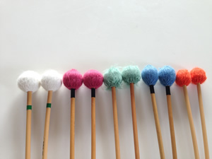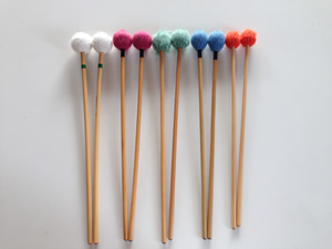 マレットは使っているうちに巻かれている毛糸が切れたり、毛羽立ってきたりします。このような場合は毛糸部分だけ巻き直して修理することができます。マレットはこのように消耗していくため、レッスンをはじめる際にはみなさまに1組ご購入いただきます。(だいたい3,000円~4,000円くらいです) |